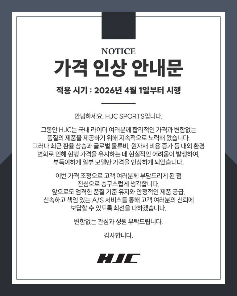 HJC 헬멧 가격 인상 안내