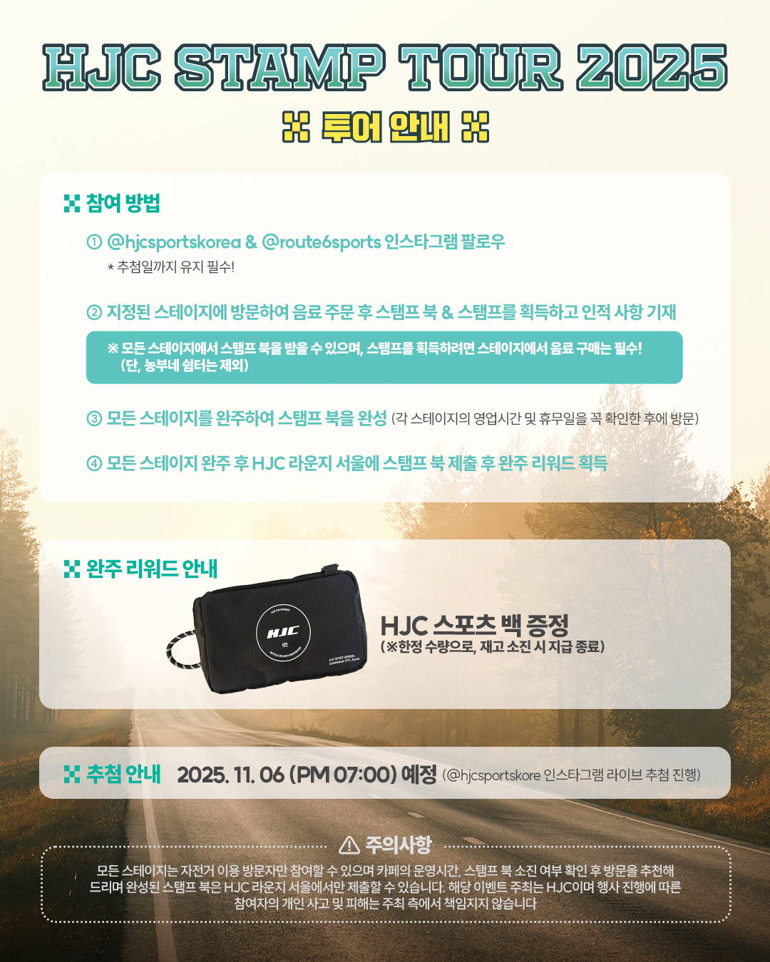 매년 가을 진행되는 HJC SPORTS의 대표 라이딩 이벤트 🚴♀️ 올해도 여행 · 미션 · 경품이 함께하는 스탬프 투어로 돌아왔습니다.